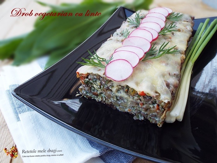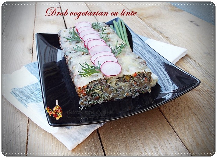 - Drobul vegetarian cu linte se lasa la racit complet in tava, dupa care se poate scoate usor din tava, se feliaza si se serveste iemdiat, alaturi de legume proaspete si verdeturi.